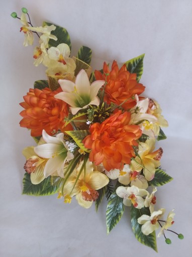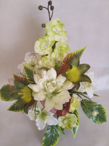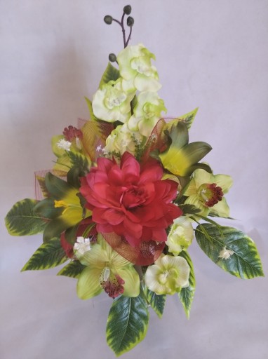 Wykonany na uniwersalnym flakonie plastikowym zabetonowanym z choiną sztuczną, gotowy tylko do włożenie do wazonu! Flakon ma średnice 12 cm od góry i 7 cm od dołu, ma 10 cm wysokości. Kompozycja do wazonu ma ok. 60 cm wysokości i 40 cm szerokości.