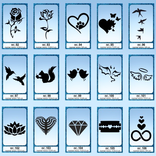 - każdy wzór posiada numer oraz rozmiar gotowego tatuażu
