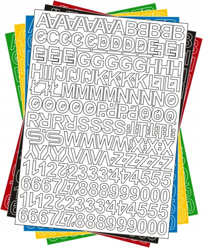 Główne zdjęcie produktu ma charakter poglądowy. W rzeczywistości, znaki na arkuszu nie posiadają obwódki (widoczny jest jedynie wycięty zarys litery i cyfry).
