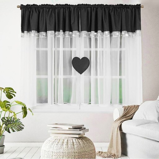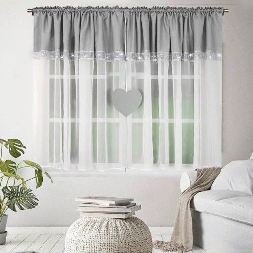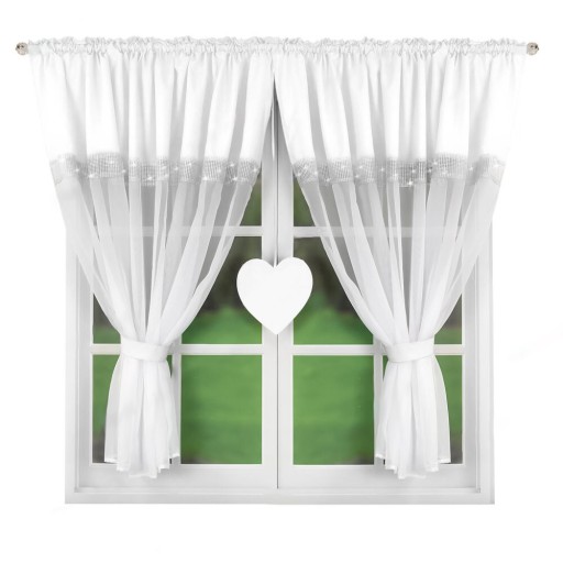 Piękna firana gotowa została uszyta z lekkiego śnieżnobiałego woalu. Ozdobiona jest cyrkoniami oraz dekoracyjnym serduszkiem, wyciętym za pomocą nowoczesnej metody laserowej z grubego filcu, który nie ulega odkształceniom. Całość przyciąga wzrok i idealnie zdobi okno, nada niepowtarzalnego wyglądu każdemu pomieszczeniu.