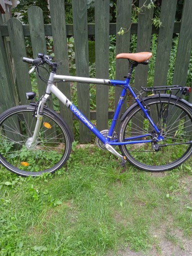 Rower trekkingowy marki Winora model Senegal. Świetny, solidny, duży rower męski. Nowe elementy to siodełko oraz lampa przednia. Mechanizmy roweru funkcjonują prawidłowo. Jako uszkodzenia trzeba wymienić zadrapania lakieru ramy oraz rogów kierownicy. Brakuje naklejki na lewej części amortyzatora. W części dalszej błotnika znajdują się trzy otwory w odległościach około 6 cm od siebie.