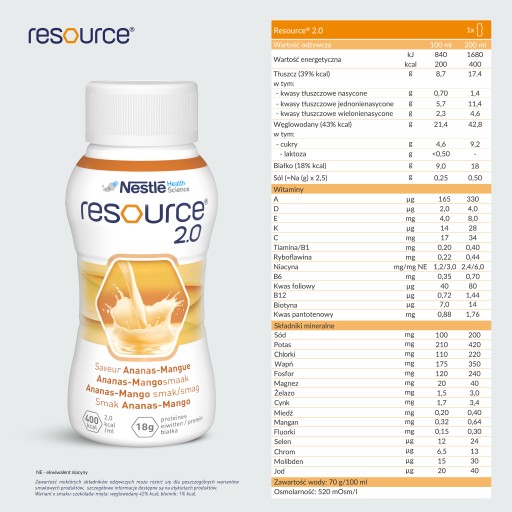 Odkryj specjalistyczny preparat odżywczy Resource 2.0 smak ananas-mango, który jest kompletną pod względem odżywczym, wysokoenergetyczną dietą w płynie.