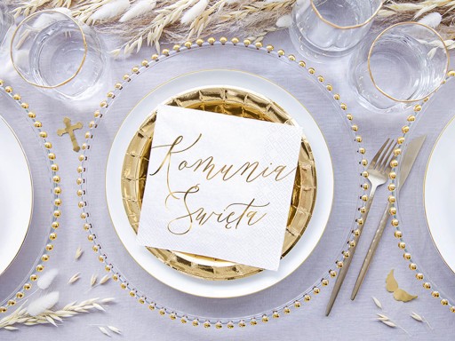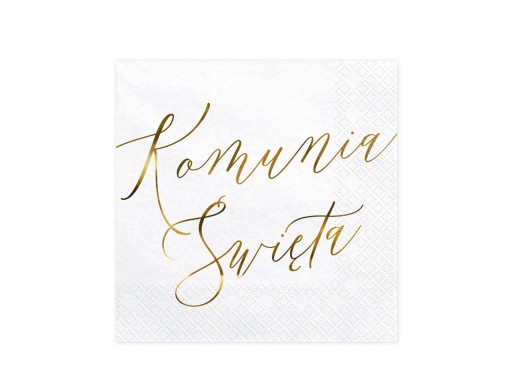 Serwetki papierowe w kolorze białym ze złotym metalizowanym napisem Komunia Święta, wymiary po rozłożeniu ok. 33 x 33 cm, wymiary po złożeniu ok. 16.5 x 16.5 cm.