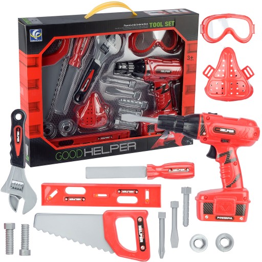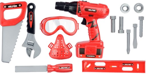 Zestaw zawiera: wkrętarka, bity, piła, śruby, okulary, maska, piła, klucz francuski, pilnik, poziomica