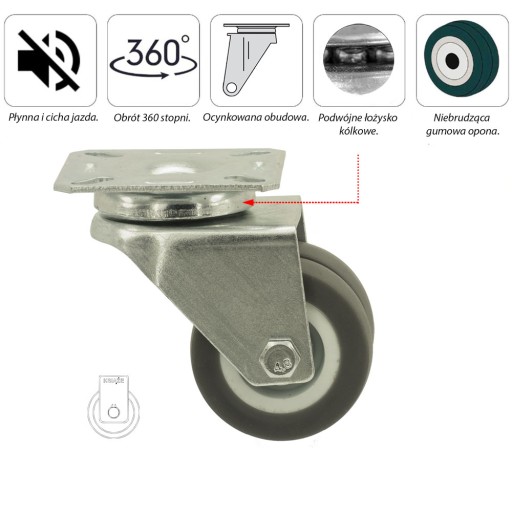 Koło składa się z polipropylenowej piasty oraz opony z elastomeru, posiada łożysko ślizgowe.