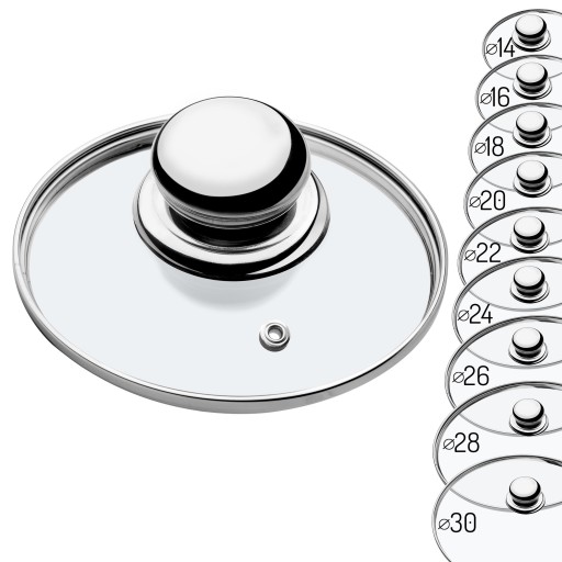 Pytanie, które powinno Ci się nasunąć w trakcie czytania, to czy pokrywa będzie pasowała do Twojego garnka i patelni. Bez obaw! Przygotowaliśmy wiele wersji rozmiarowych – od małych pokrywek (14, 16, 18, 20 cm), po większe (22, 24, 26, 28, 30 cm). Warto więc zaopatrzyć się w pokrywy o różnych rozmiarach. Szkło, z którego wykonano akcesorium, jest pozbawione szkodliwych substancji, jest więc najlepszym materiałem w przypadku przyrządzania dań.