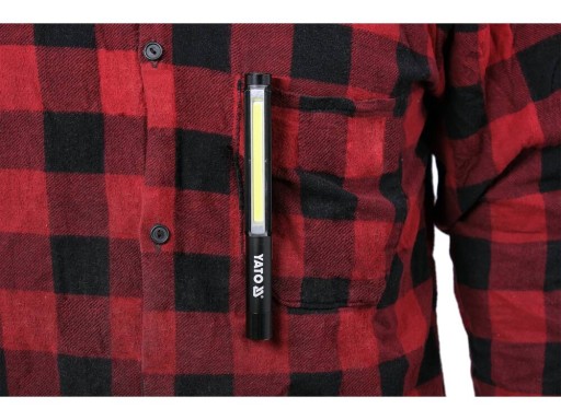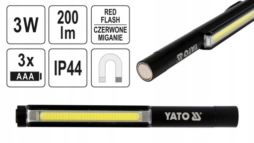 Aluminiowa latarka inspekcyjna YATO z 3 trybami pracy, w tym czerwonym światłem ostrzegawczym. Dioda COB zapewnia mocne, rozproszone światło 200lm.
