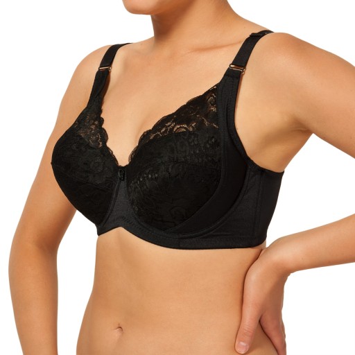 model 1670 zapinany 3 rzędy na 3 haftki,szerokie regulowane ramiączka,miseczki z fiszbinami i delikatną koronką,na środku subtelna ozdoba.