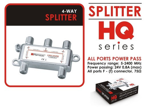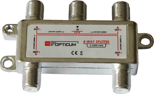 Liczba wejść: 1 szt. Liczba wyjść: 4 szt. Zakres częstotliwości: 5 ... 2450 MHz Możliwość podania napięcia na przedwzmacniacz: tak Ekranowanie: tak Impedancja: 75 Ω Waga: 0.04 kg Wymiary: 73 x 46 x 17 mm Producent / Marka: OPTICUM Gwarancja: 2 lata