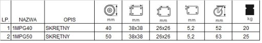 Koło składa się z niebrudzącej gumy, posiada łożysko ślizgowe. Mocowanie zestawu na płytkę o kodzie 1MPG40. W tabeli pod pozycją 1.