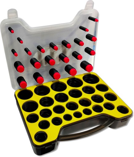 W zestawie znajduje się łącznie aż 735 szt. uszczelek w różnych rozmiarach, opakowane w solidną skrzynkę z tworzywa sztucznego, zamykaną na dwa mocne zatrzaski.