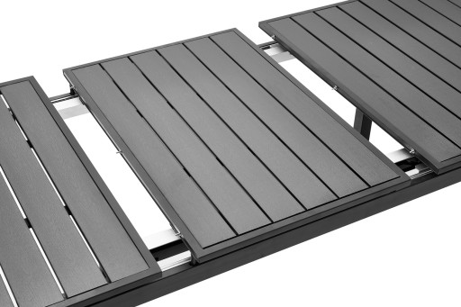 Konstrukcję stołu oraz krzeseł stanowi wysokiej jakości aluminium, malowane metodą proszkową. W oferowanym zestawie blat stołu wykonany jest z nieabsorbujących wody desek kompozytowych WPC, używanych między innymi do produkcji nowoczesnych systemów tarasowych i elewacji. Najważniejszym elementem konstrukcyjnym stołu są prowadnice pozwalające na rozszerzenie stołu aż do 240cm. Ich zastosowanie sprawia, że po zmontowaniu całości stół jest jeszcze bardziej przestronny, a co za tym idzie może przy nim usiąść jeszcze większa liczba gości! Takie rozwiązanie pozwoliło na uzyskanie wolnej przestrzeni pod stołem i uniknąć niepotrzebnych dodatkowych konstrukcji przeszkadzających w wygodnym korzystaniu z mebli.