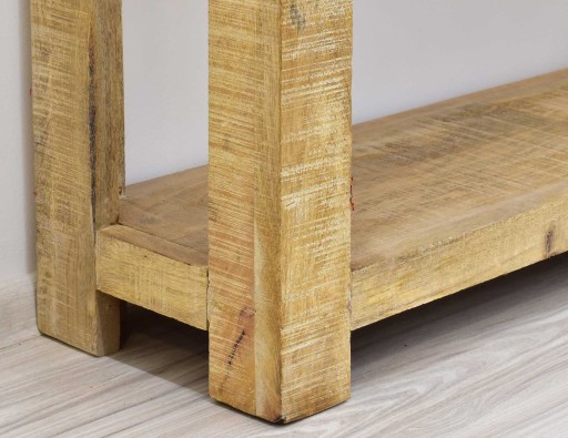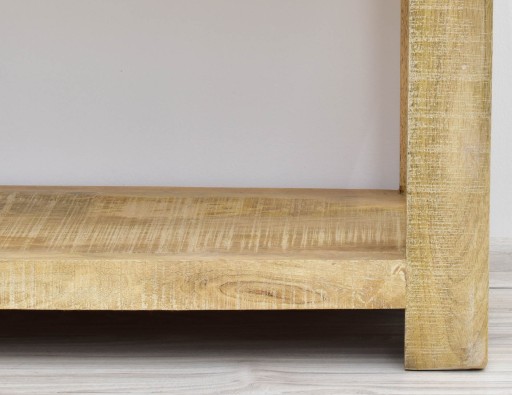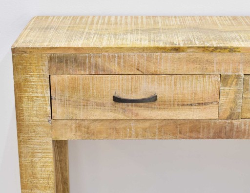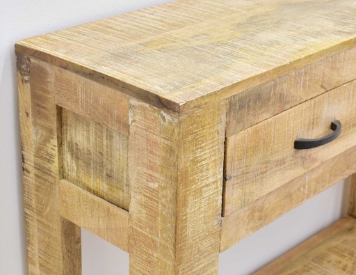 Nieduża konsola, wykonana z jasnego drewna mango, posiada dwie praktyczne szufladki pod masywnym blatem oraz półkę umieszczona na spodzie. Mebel wykonano w 100% z litego drewna. Wraz z lustrem, z tej samej kolekcji, może stworzyć niebanalny zestaw w aranżacji w stylu industrialnym.