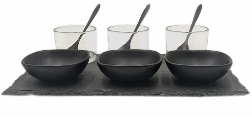 Zestaw miseczek i mini szklanek umieszczony został na kamiennej podstawie z czarnego łupka.