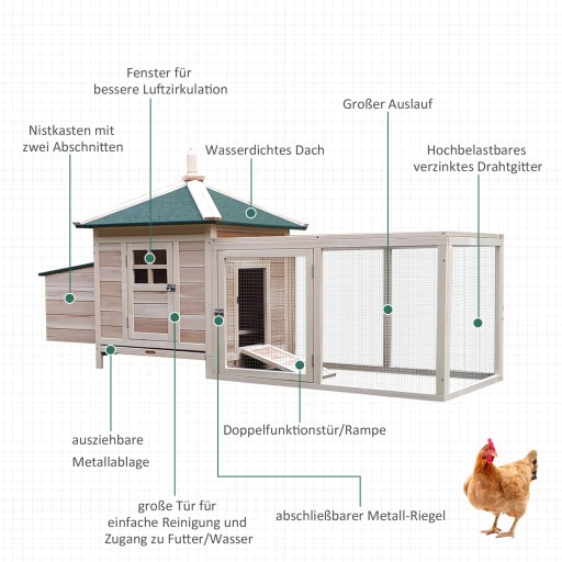 Twoje kurczaki pokochają ten kurnik – swój nowy dom! Dzięki kurnikowi PawHut możesz zapewnić im własny dom, który jest jednocześnie stylowy i funkcjonalny. Przestrzeń mieszkalna z grzędą i bocznym kojcem tworzy dużą przestrzeń życiową dla Twoich kurczaków. Praktyczna budka lęgowa z odchylanym dachem zapewnia łatwy dostęp do jaj i ułatwia ich wyjmowanie z kosza. Dzięki asfaltowemu dachowi i wodoodpornej powłoce nasz kojec chroni kurczaki przed deszczem lub promieniowaniem słonecznym.