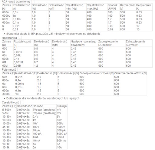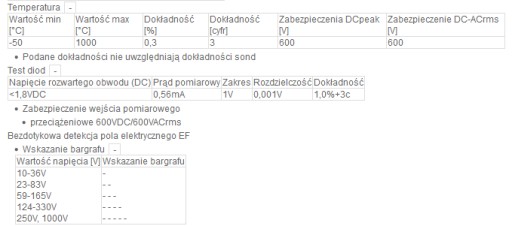 Dokładność: +- (% wartości wskazywanej + liczba cyfr najmniej znaczących), jeśli nie jest określona inaczej, dla temp 23 stopnie C +- 5 stopni i RH do 75%