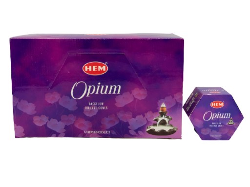 Stożkowe indyjskie kadzidełka typu backflow o zapachu Opium firmy HEM. Produkt naturalny wykonany z drewna bambusowego, węgla drzewnego, żywicy naturalnej oraz aromatu.