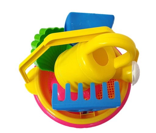 ZESTAW ZABAWEK DO PIASKOWNICY, NA PLAŻĘ - WIADERKO Z SITKIEM, FOREMKAMI, GRABKAMI, ŁOPATKĄ oraz KONEWKĄ.