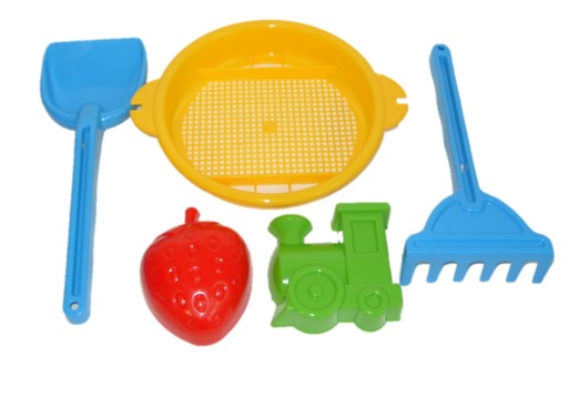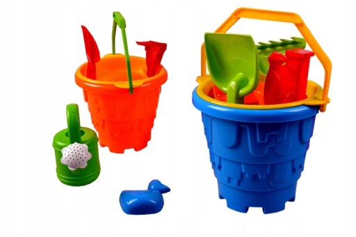 Zestawy mogą się różnić kształtem foremek i kolorami łopatki i grabek.