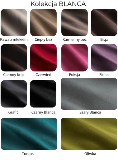 Welurowa tkanina w kolorze GRAFITOWYM z kolekcji BLANCA, plamo oraz ognioodporna, potwierdzona tzw. testem papierosa. Całość dopełniają nóżki. Do ich wykonania używamy polskiego drewna bukowego. Starannie wybieramy każdy element, aby nie było w nim wad, sęków czy wgnieceń. Ty decydujesz o kolorze, a do wyboru jest naturalny buk, a także biały, czarny, wenge, orzech, srebro i złoto. Zanim złączymy wszystkie elementy i wyślemy do Ciebie, nóżki są lakierowane natryskowo, co gwarantuje, że włoski lub grecki lakier rozprowadzony jest idealnie równo na całej powierzchni.