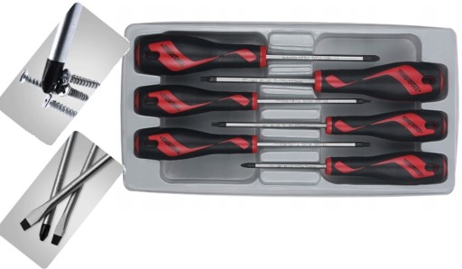 Zestaw 2 wkrętaków krzyżowych Pozidriv i 4 do gniazd typu TX (Torx). Trzon wykonany ze stali TT-MV-plus. Ergonomiczna rękojeść dwukomponentowa z otworem do zawieszania.