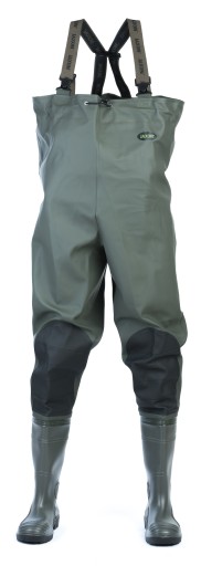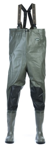 Wodery wędkarskie do piersi Jaxon Prestige Plus AB-PSE. Profesjonalne wodery wędkarskie wykonane ze specjalnego wodoodpornego tworzywa Plavitex. Wodery znacznie bardziej komfortowe, zapewniające dużo większą swobodę ruchów od standardowych gumowych woderów. Niezbędne wyposażenie każdego wędkarza chcącego skutecznie łowić na spinning lub muchę. Wodery wyposażone w mocne i zarazem komfortowe szelki z możliwością regulacji długości. Znakomitym elementem woderów są specjalne wzmacniane wstawki w okolicy kolan, świetnie ochraniające nogi podczas chodzenia w odstających zaroślach i krzakach. Wodery dobrze sprawdzają się podczas łowienia zarówno w porze jesienno-zimowej, kiedy woda jest zimniejsza jak i w letnie wypady nad rzekę, jezioro lub morze. Zintegrowane gumowe buty również posiadają dodatkowe zabezpieczające warstwy ochronne, podeszwa wyposażona w protektor zapewniający ochronę i wygodę podczas chodzenia po nierównym wyboistym podłożu.