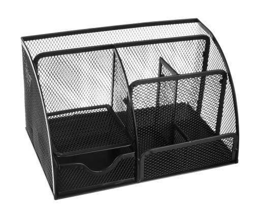 Pojemnik na przybory biurowe to przydatne akcesorium, do tego jest niezwykle pojemne – posiada jedną dużą przegródkę oraz 4 mniejsze przegródki, a także półkę i szufladkę, w których każdy bez problemu zmieści wszystkie potrzebne akcesoria biurowe.