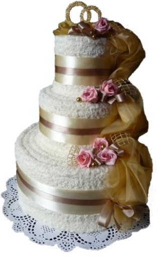 Piękny i oryginalny prezent na ślub i rocznicę ślubu - praktyczny i elegancki komplet 4 ręczników w kształcie tortu z bogatą dekoracją kwiatową.