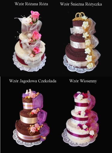 Piękny i oryginalny prezent na ślub i rocznicę ślubu - praktyczny i elegancki komplet 4 ręczników w kształcie tortu z bogatą dekoracją kwiatową.