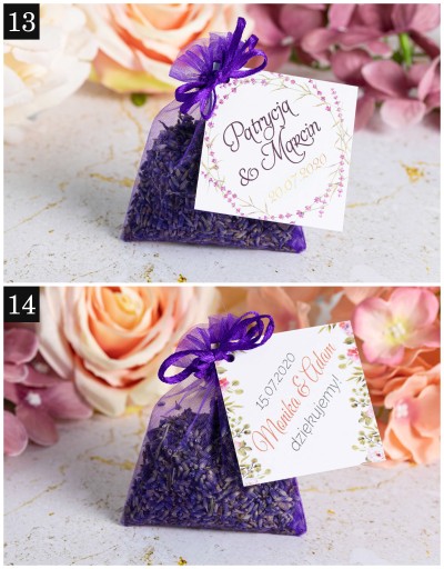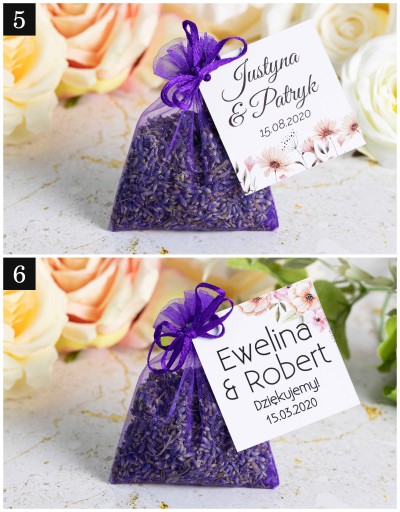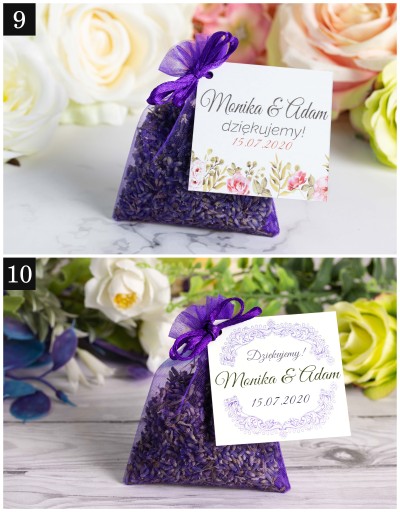 Aromatyczna suszona lawenda w woreczku z organzy z personalizowaną zawieszką