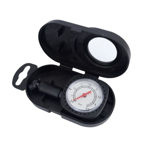 Ciśnieniomierz wykonany z solidnego tworzywa sztucznego. Zakres pomiaru wynosi od 0,5 do 4,5 bar. Eleganckie etui zagawarantuje bezpieczeństwo przechowywania manometru.