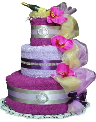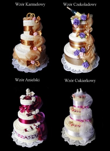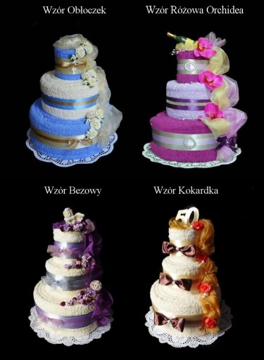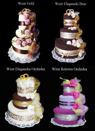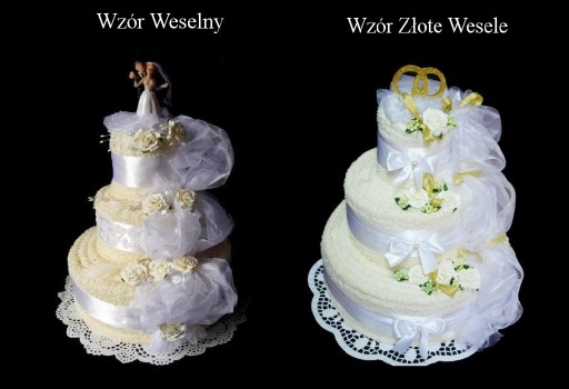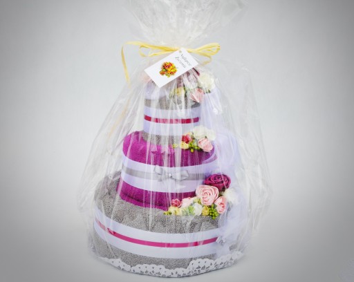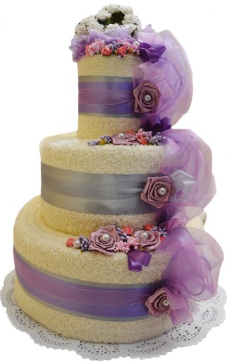 Piękny i oryginalny prezent na ślub i rocznicę ślubu - praktyczny i elegancki komplet 3 ręczników w różnych rozmiarach w kształcie tortu z bogatą dekoracją kwiatową.
