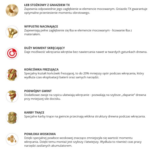 Wkręt konstrukcyjny z łbem stożkowym i gniazdem TX do połączeń konstrukcyjnych elementów drewnianych m.in. litych, klejonych i płyt drewnopochodnych.