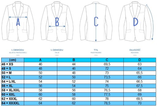 - Przy wyborze rozmiaru proponujemy zmierzyć swoje dotychczas noszone ubrania, te które leżą na Tobie najlepiej (marynarka lub kurtka) - porównaj z tabelą.