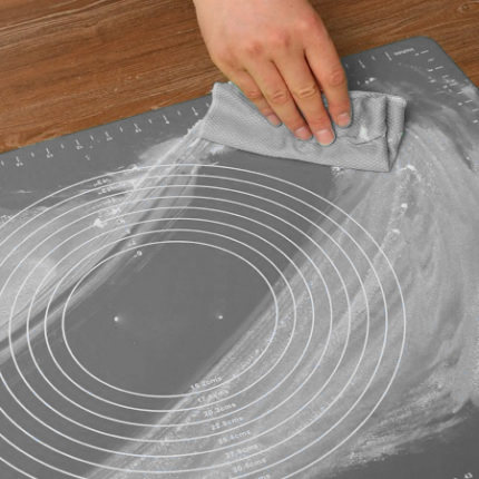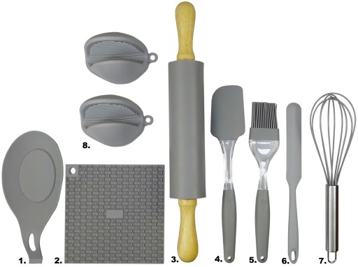 Stolnica idealnie przylega do stołu lub blatu. Górna powierzchnia wykonana została z porowatej struktury co zapobiega przywieraniu ciasta. Stolnica posiada również przydatne okręgi z wpisaną średnicą oraz boczne miarki. W zestawie znajduje się funkcjonalny, silikonowy wałek do ciasta z drewnianymi uchwytami, który nie nasiąka płynami i zapachami ale przede wszystkim nie klei się do ciasta. Zawiera on również podstawka pod łyżkę, nóż silikonowy, trzepaczka do jajek, pędzelek silikonowy, szpatułkę silikonową, kuchenną łapkę silikonową oraz podstawkę pod garnek.
