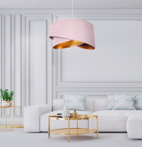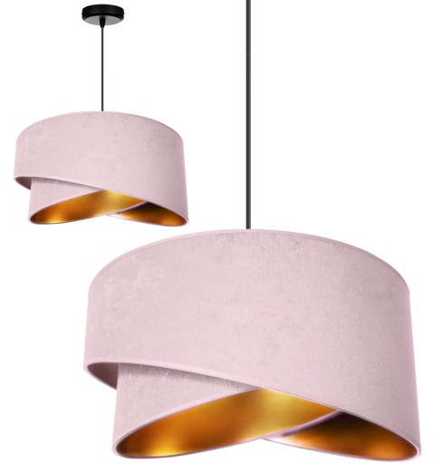 Lampa wykonana jest z dwóch abażurów. Z zewnątrz abażury ozdobione są tkaniną z weluru w kolorze różowym, a od wewnątrz abażury pokryte są złotym pcv.