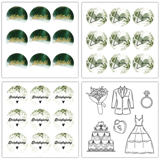 Samoprzylepne naklejki mają nacięte obrysy kształtów. W zestawie znajduje się 8 arkuszy o wymiarze 10 x 10 cm z mixem naklejek o powiązanej temnatyce i kolorystyce. W ofercie znajdują się także Księgi Gości w różnorodnych stylach: kwiatowe, rustykalne, boho etc.