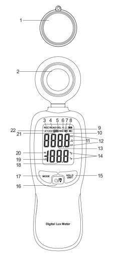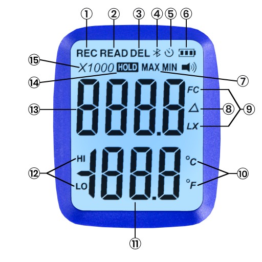 - Jednostki pomiaru oświetlenia i temperatury: Lux/℃; Lux/℉; FC/℃; FC/℉