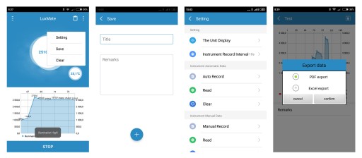 Dane mogą być zapisywane i przechowywane w pamięci telefonu, a także eksportowane do arkuszy danych i przenoszone na komputer.