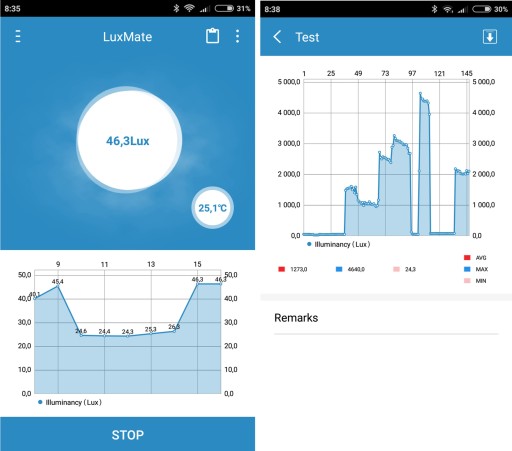 Aplikacja obrazuje na wykresie dane z rzeczywistego pomiaru natężenia oświetlenia. Pozwala także na powrót do danych w późniejszym czasie oraz kasowanie zbędnych pomiarów.