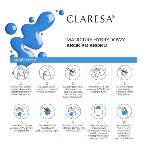 Na wcześniej utwardzoną bazę hybrydową Claresa, nałóż cienką warstwę kolorowego lakieru hybrydowego i utwardź go w lampie UV/LED. W celu osiągnięcia satysfakcjonującego efektu, czynność możesz powtórzyć. Stylizację zabezpiecz aplikując i utwardzając TOP Claresa.