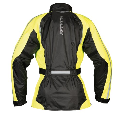 Skutecznie ochroni w razie deszczu dzięki wykonaniu z nieprzemakalnego materiału oraz zastosowaniu laminowanych szwów. Aby zwiększyć widoczność motocyklisty na drodze w niesprzyjających warunkach pogodowych zastosowano liczne elementy odblaskowe 3M Scotchlite™. Żółty kolor wykorzystany w odzieży z pewnością pozwoli zauważyć Cię z daleka. Dla zwiększenia komfortu użytkowania posiada ona delikatne wykończenie kołnierza. Kurtkę możemy bez problemu dopasować do swojej sylwetki dzięki dodatkowym ściągaczom w pasie oraz rzepom na mankietach.