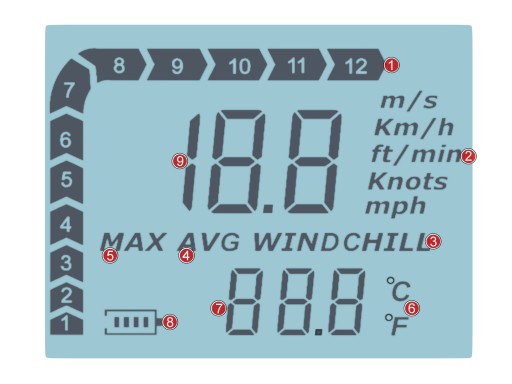 - Zakres: 0-30 m/s / 0-5860 Ft/min / 0-55 Knots / 0-90 Km/h / 0-65 Mph
