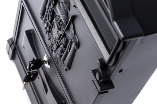 Wielofunkcyjna skrzynka pocztowa o wymiarach 412 x 253 x 87 mm. Korpus wykonany z blachy stalowej o wysokiej odporności na korozję, malowanej proszkowo w kolorze grafitowym, natomiast front ze zdobionego aluminium. Produkt łączy w sobie wysoką funkcjonalność, trwałość oraz elegancki wygląd.