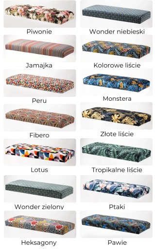 Kolekcja tkanin wzorzystych, to wysokiej jakości materiały, które nie dość, że pięknie prezentują się na ławeczkach, są bardzo odporne i łatwe w utrzymaniu czystości. Kolory są odporne na promienie słoneczne, dzięki czemu tkanina utrzyma swoją świetność na długie lata.