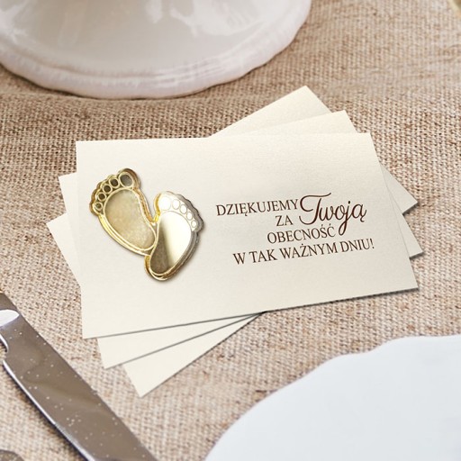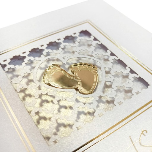 Eleganckie zaproszenia na chrzest święty, wykonane z wysokiej jakości metalizowanego papieru w kolorze białym mieniącym się na złoto. Okładkę ozdabia precyzyjne cięcie laserowe ażurowego wzoru. Uroku dodaje trójwymiarowa aplikacja w postaci dziecięcych stópek z lustrzanego materiału w kolorze złotym. Zaproszenie premium świetnie sprawdzi się jako zaproszenie na chrzest zarówno dla chłopczyka jak i dla dziewczynki.