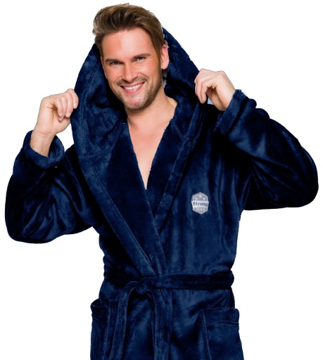 Szlafrok męski z kapturem, wiązany w pasie, z miękkiej dzianiny (soft), na biodrach kieszenie zewnętrzne, na wysokości klatki piersiowej naszyta aplikacja.