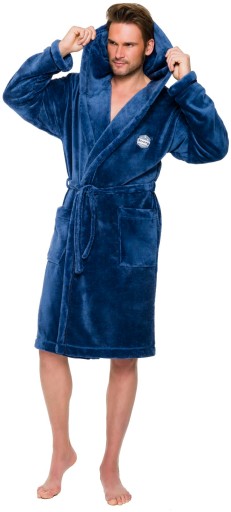 Szlafrok męski z kapturem, wiązany w pasie, z miękkiej dzianiny (soft), na biodrach kieszenie zewnętrzne, na wysokości klatki piersiowej naszyta aplikacja.