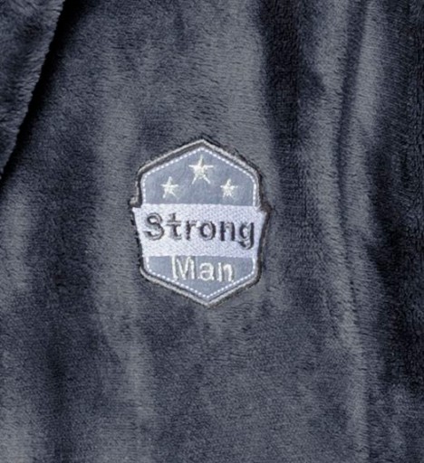 Szlafrok męski z kapturem, wiązany w pasie, z miękkiej dzianiny (soft), na biodrach kieszenie zewnętrzne, na wysokości klatki piersiowej naszyta aplikacja.