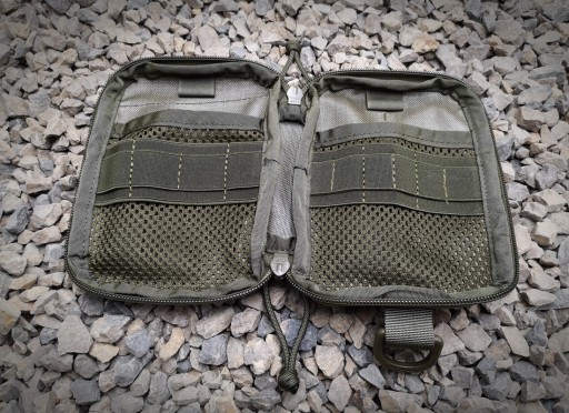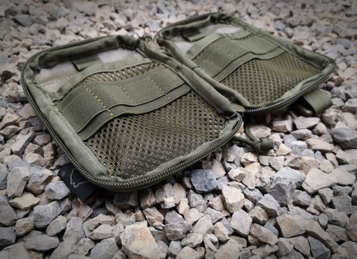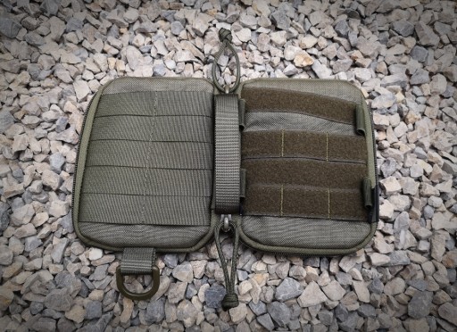 Na przodzie organizera znajduje się panel rzep Alfatex® marki Velcro® na taśmach w systemie molle, który możemy oblepić naszywkami, morale patches, przyczepić karabińczyk lub zamocować dodatkową ładownicę, czy też przepleść do niego za pomocą paracordu pochewkę na nóż. Gumki po bokach na długopisy, lightsticki, krzesiwa, małe kubotany itp. Wewnątrz przegródka w której idealnie zmieści się notatnik, telefon lub inna płaska rzecz. Dzięki siatce widać co znajduje się w środku. Na kieszonce naszyta guma tworząca przegródki o szerokości: 4cm; 3,5cm; 2cm. Na górze pętelka do zaczepienia kluczy, linek itp. Po drugiej stronie kolejna kieszonka z siatki i gumowymi przegródkami o szerokościach 5cm; 3cm; 2,5cm